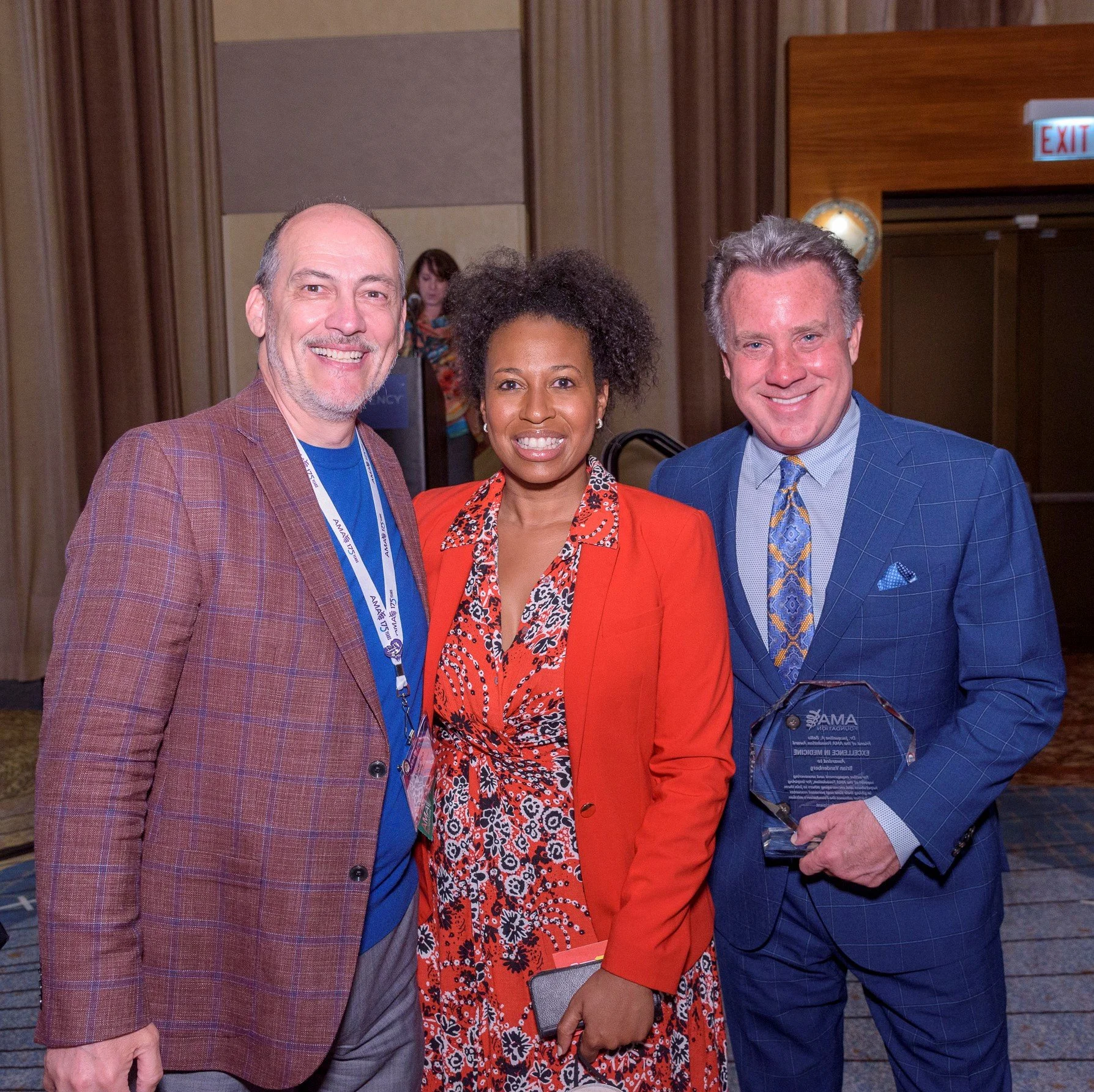 (L-R) Rodrigo Sierra, Chief Communications Officer, AMA; Dr. Aletha Maybank, former Chief Health Equity Officer and Senior Vice President, AMA; and Brian Vandenberg pose for a photo at the 2022 Excellence in Medicine Awards.